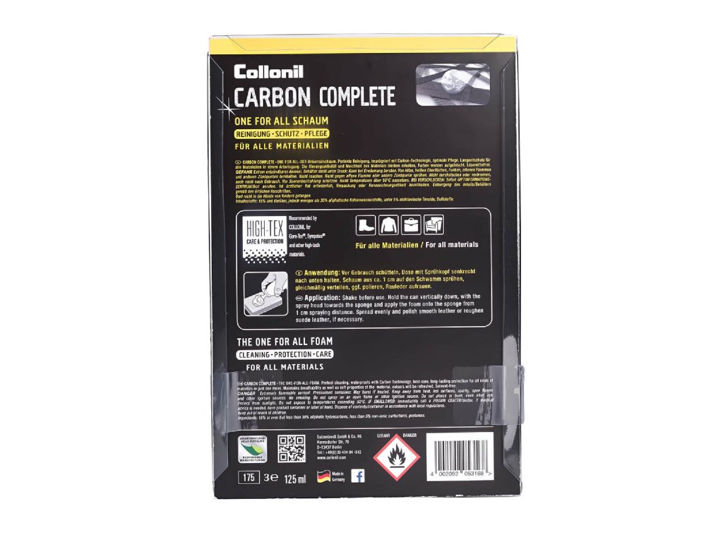 Univerzální pěna s karbonovou technologií. Perfektně čistí, impregnuje a ošetřuje v jednom kroku. Chrání před vlhkostí, udržuje prodyšnost stejně jako pružnost materiálu, osvěžuje barvy. Zabezpečuje dlouhotrvající ochranu pro všechny druhy materiálů. Neobsahuje rozpouštědla a lze jej použít i v uzavřených prostorách